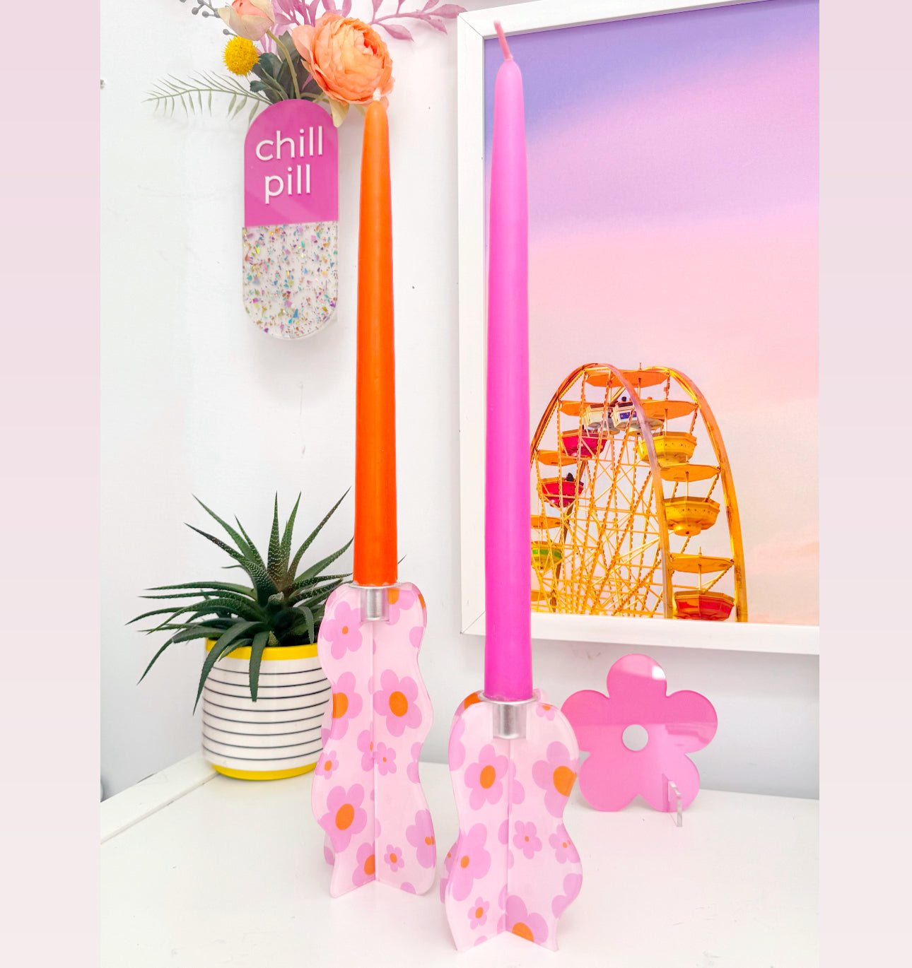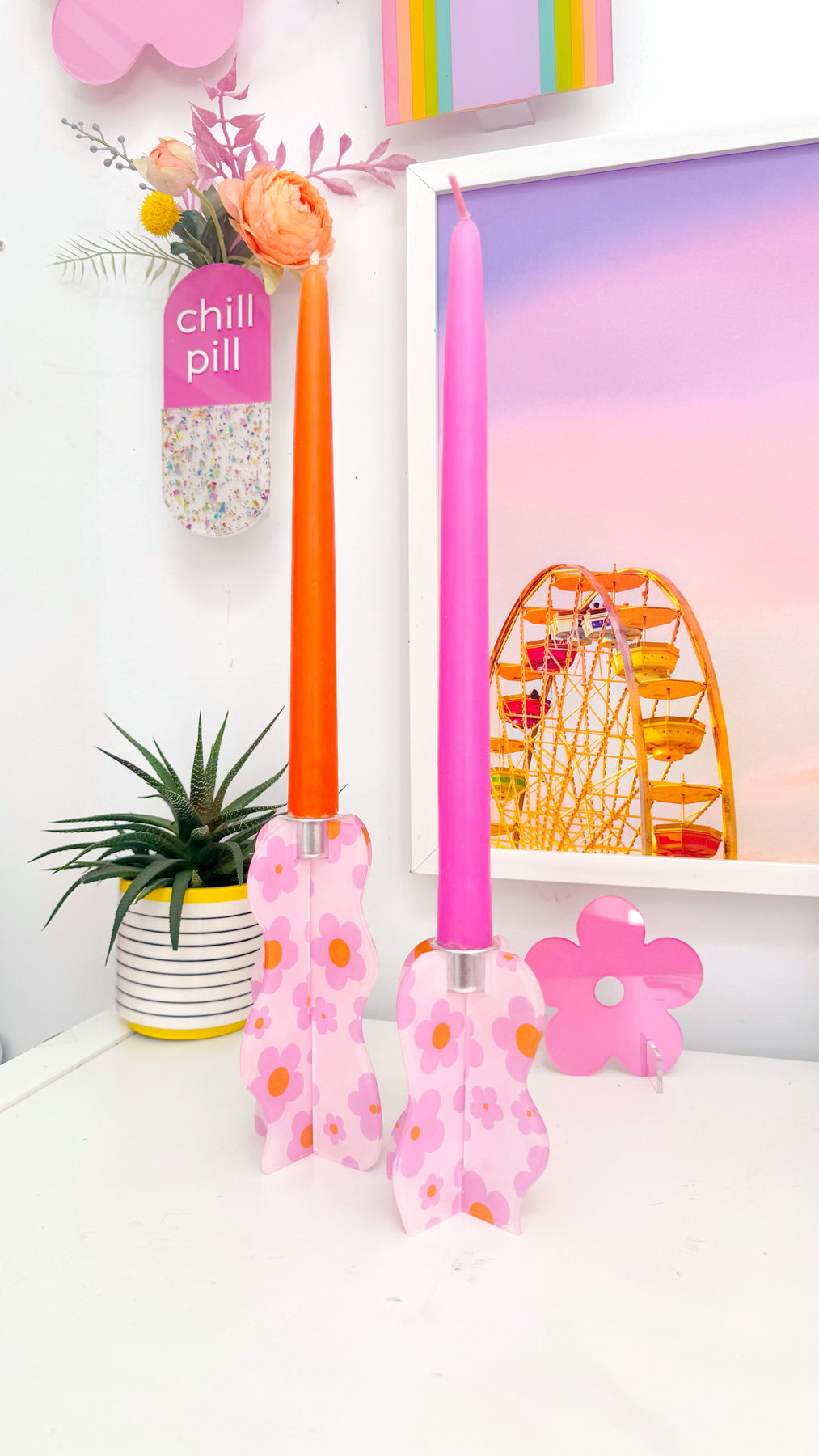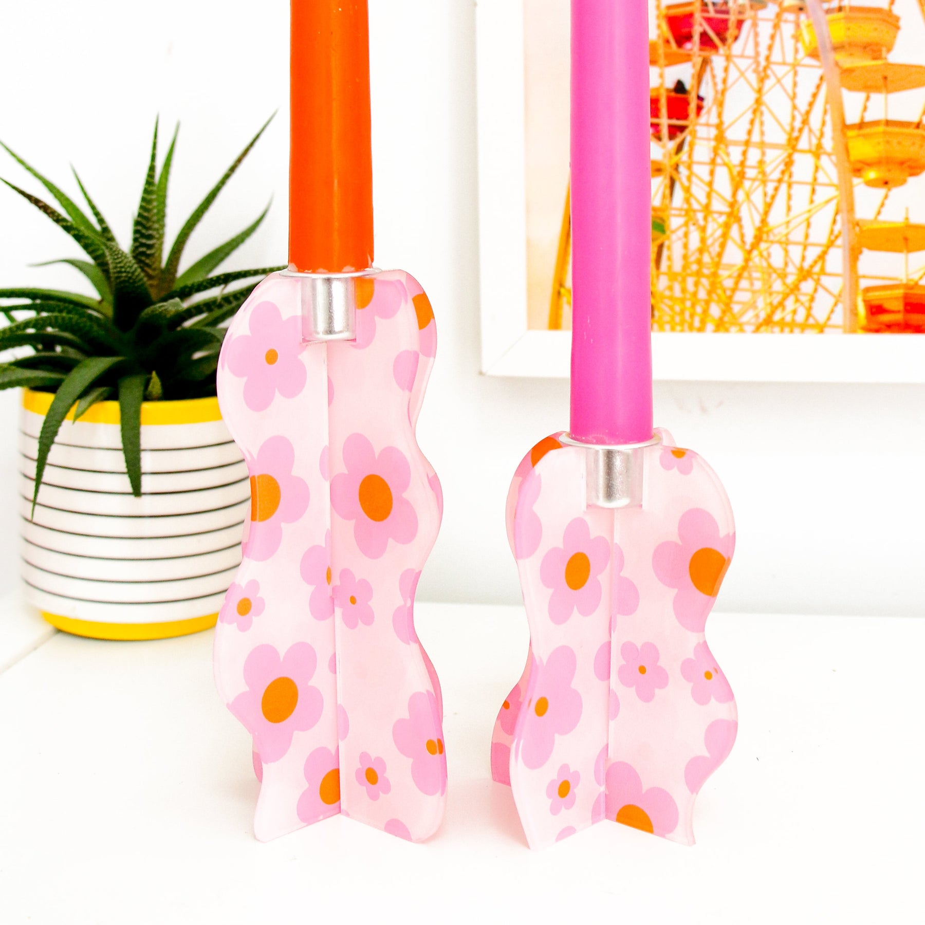 Our color blocked wavy squiggle acrylic taper candle holders are the cutest dopamine decor for your home. Featuring our pink and orange daisy print with a fun wavy design in two height options. Choose from 6” tall or 4” tall sizes. These come flat packed and are easy to assemble. Just slide the base pieces together and slip in the metal candle cup. To clean, simply freeze the acrylic pieces and the wax will pop right off. Listing is for one candle holder in the size of your choice.